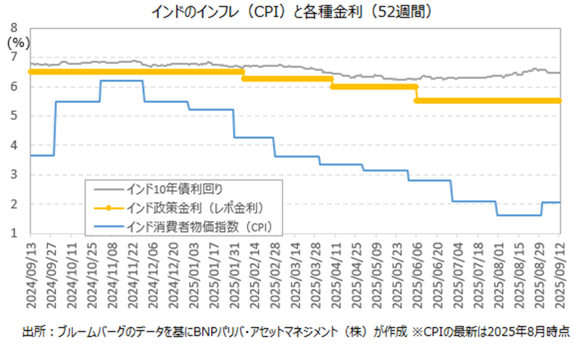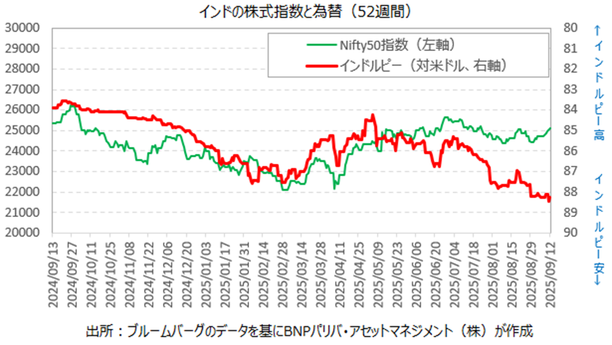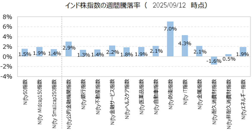 先週のインド株式市場は、セクターローテーションの動きがみられる中、堅調な動きとなりました。国内需要に対する楽観的見通しに加えて、インドGST2.0(物品・サービス税)の制度改革も追い風となっています。Nifty50指数は、前週比で1.5%上昇し、2週連続のプラスとなりました。その他、規模別の指数を見ると、Nifty Midcap150指数とNifty Smallcap250指数は、テクノロジー関連株への注目が高まったことなどから、それぞれ1.9%と1.4%上昇となっています。外国人投資家(FIIs)は、週を通じて579億ルピー相当を売り越す一方、国内投資家(DII)からの資金流入が継続しています。通貨インドルピーは、対米ドルで88ルピー台と過去最安値圏で推移しています。商品市場では、世界経済の不透明感やインドルピー安を受けて、金価格が堅調な動きとなっています。